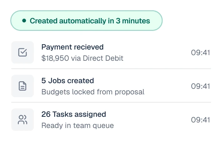 Instant Workflows. Jobs, budgets, and tasks auto-create the moment the client signs.